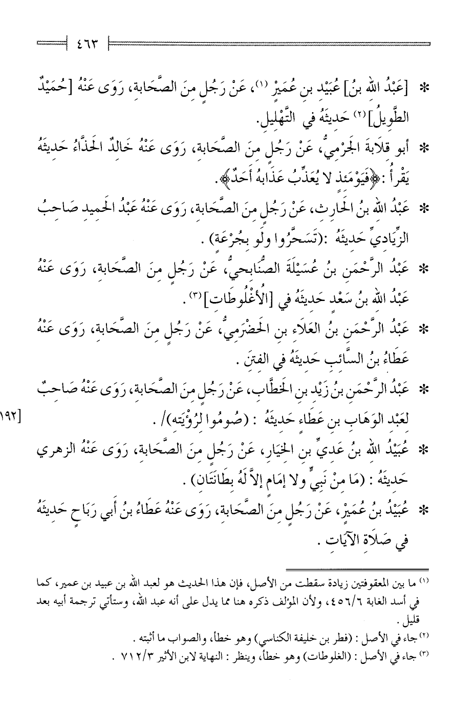 * عَبْدُ الرَّحْمَنِ بنُ عُسَيْلَةَ الصُّنَابِحيُّ، عَنْ رَجُلٍ مِنَ الصَّحَابةِ، رَوَى عَنْهُ عَبْدُ الله بنُ سَعْدٍ حَدِيثَهُ في [الأُغْلُوطَاتِ] (¬3).