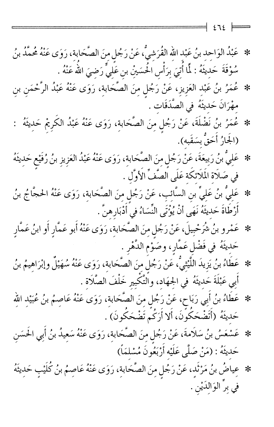 * عَبْدُ الوَاحِدِ بنُ عَبْدِ اللهِ القُرَشِيُّ، عَنْ رَجُلٍ منَ الصَّحَابةِ، رَوَى عَنْهُ مُحَمَّدُ بنُ سُوْقَةَ حَدِيثَهُ: لمَّا أُتِيَ بِرَأْسِ الحُسَيْنِ بنِ عَلِيٍّ رَضِيَ الله عَنْهُ.