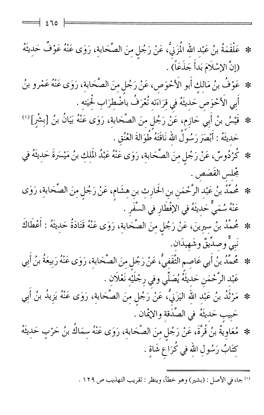 * عَلْقَمَةُ بنُ عَبْدِ الله المُزَنِيُّ، عَنْ رَجُلٍ مِنَ الصَّحَابةِ، رَوَى عَنْهُ عَوْفٌ حَدِيثَهُ (إنَّ الإسْلَامَ بَدأَ جَذَعًا).