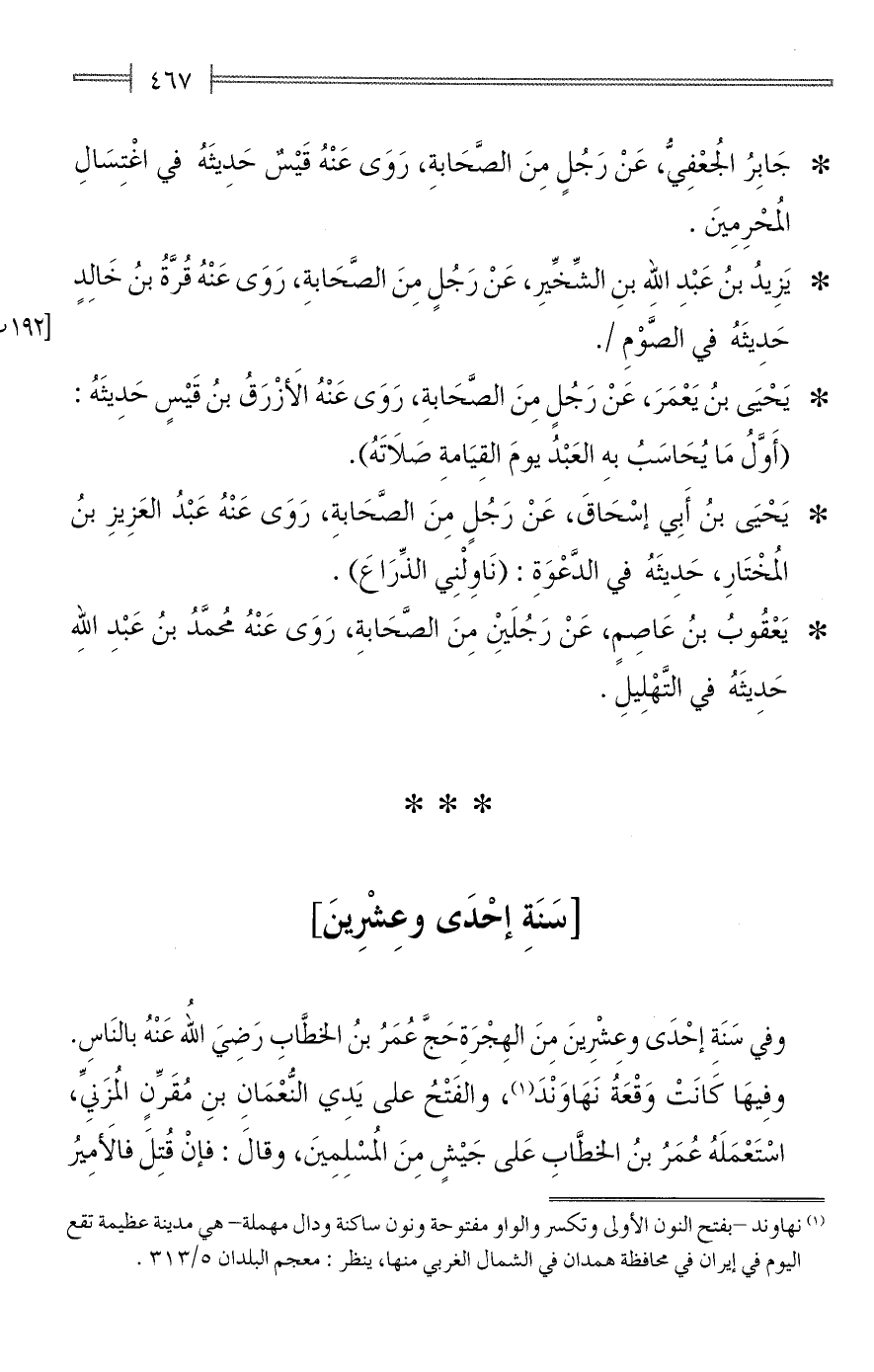 وفي سَنَةِ إحْدَى وعِشْرِينَ مِنَ الهِجْرَةِ حَجَّ عُمَرُ بنُ الخطَّابِ رَضِيَ اللهُ عَنْهُ بالنَّاسِ. وفِيهَا كَانَتْ وَقْعَةُ نَهَاوَنْدَ (¬1)، والفَتْحُ على يَدِي النُّعْمَانِ بنِ مُقَرِّنٍ المُزَنِيِّ، اسْتَعْمَلَهُ عُمَرُ بنُ الخطَّابِ عَلى جَيْشٍ مِنَ المُسْلِمِينَ، وقالَ: فإنْ قُتِلَ فالأَمِيرُ
