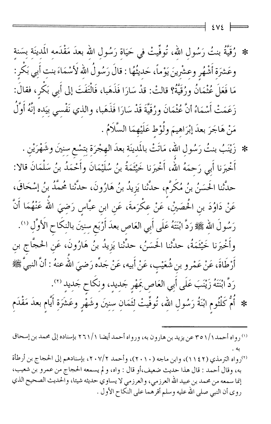 أَخْبَرنا أَبِي رَحِمَهُ الله، أَخْبَرنا خَيْثَمَةُ بنُ سُلَيْمَانَ وأَحْمَدُ بنُ سَلْمَانَ قالا: حدَّثنا الحَسَنُ بنُ مُكَرَّمٍ، حدَّثنا يَزِيدُ بنُ هَارُونَ، حدَّثنا مُحمَّدُ بنُ إسْحَاقَ، عَنْ دَاوُدَ بنِ الحُصَيْنِ، عَنْ عِكْرَمةَ، عَنِ ابنِ عبَّاسٍ رَضِيَ الله عَنْهُمَا أَنَّ رَسُولَ الله - صلى الله عليه وسلم - رَدَّ ابْنَتَهُ عَلَى أَبِي العَاصِ بعدَ أَرْبَعِ سِنِينَ بالنِكَاحِ الأَوَّلِ (¬1).