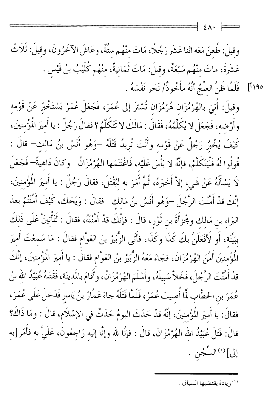 وقِيلَ: أُتِيَ بالهُرْمُزَانِ هُرْمُزَانِ تُسْتَر إلى عُمَرَ، فَجَعَلَ عُمَرُ يَسْتَخْبِرُ عَنْ قَوْمهِ وأَرْضِهِ، فَجَعَلَ لا يُكَلِّمُهُ، فَقَالَ: مَالَكَ لا تَتَكَلَّمُ؟ فقالَ رَجُلٌ: يا أَمِيرَ المُؤْمِنينَ، كَيْفَ يُخْبِرُ رَجُلٌ عَنْ قَوْمهِ وأَنْتَ تُرِيدُ قَتْلَهُ -وَهُو أَنَسُ بنُ مَالِكٍ- قالَ: قُولُوا لَهُ فَلْيَتَكَلَّمْ، فإنَّهُ لا بَأْسَ عَلَيْهِ، فَاغْتَنَمَها الهُرْمُزَانُ -وكانَ دَاهِيةً- فَجَعَلَ لَا يَسْأَلُهُ عَنْ شَيءٍ إلَّا أَخْبَرهُ، ثُمَّ أَمَرَ بهِ لِيُقْتَلَ، فقالَ رَجُلٌ: يا أَمِيرَ المُؤْمِنِينَ، إنَّكَ قدْ أَمَّنْتَ الرَّجُلَ -وَهُو أَنَسُ بنُ مَالِكٍ- فقالَ: وَيْحَكَ، كَيْفَ أَمَّنْتُمْ بعدَ البَراءِ بنِ مَالِكٍ ومجْزأَةَ بنِ ثَوْرٍ، قالَ: فإنَّكَ قدْ أَمَّنْتَهُ، فقالَ: لَتَأْتِيَنَّ عَلَى ذَلِكَ بِبَيِّنَةٍ، أَو لأَفْعَلَنَّ بكَ كَذَا وكَذَا، فأَتَى الزُّبَيْر بنَ العَوَّامِ فقالَ: مَا سَمِعْتَ أَمِيرَ المُؤْمِنينَ أَمَّنَ الهُرْمُزَانَ، فجَاءَ مَعَهُ الزُّبَيْر بنُ العَوَّامِ فقالَ: يا أَمِيرَ المُؤْمِنينَ، إنَّكَ قدْ أَمَّنْتَ الرَّجُلَ، فَخَلَّا سَبِيلَهُ، وأَسْلَمَ الهُرْمُزَانُ، وأَقَامَ بالمَدِينَةِ، فَقَتَلهُ عُبَيْدُ اللهِ بنُ عُمَرَ بنِ الخطَّابِ لمَّا أُصِيبَ عُمَرُ، فَلَمَّا قَتَلَهُ جاءَ عَمَّارُ بنُ يَاسِرٍ فَدَخلَ عَلَى عُمَرَ، فقالَ: يا أَمِيَر المُؤْمِنِينَ، إنَّهُ قدْ حَدَثَ اليومُ حَدَثٌ في الإسْلَامِ، قالَ: ومَا ذَاكَ؟ قالَ: قَتَلَ عُبَيْدُ الله الهُرْمُزَانَ، قالَ: فإنَّا للهِ وإنَّا إليهِ رَاجِعُونَ، عَلَيَّ بهِ فأَمَر [بهِ إلى] (¬1) السِّجْنِ.