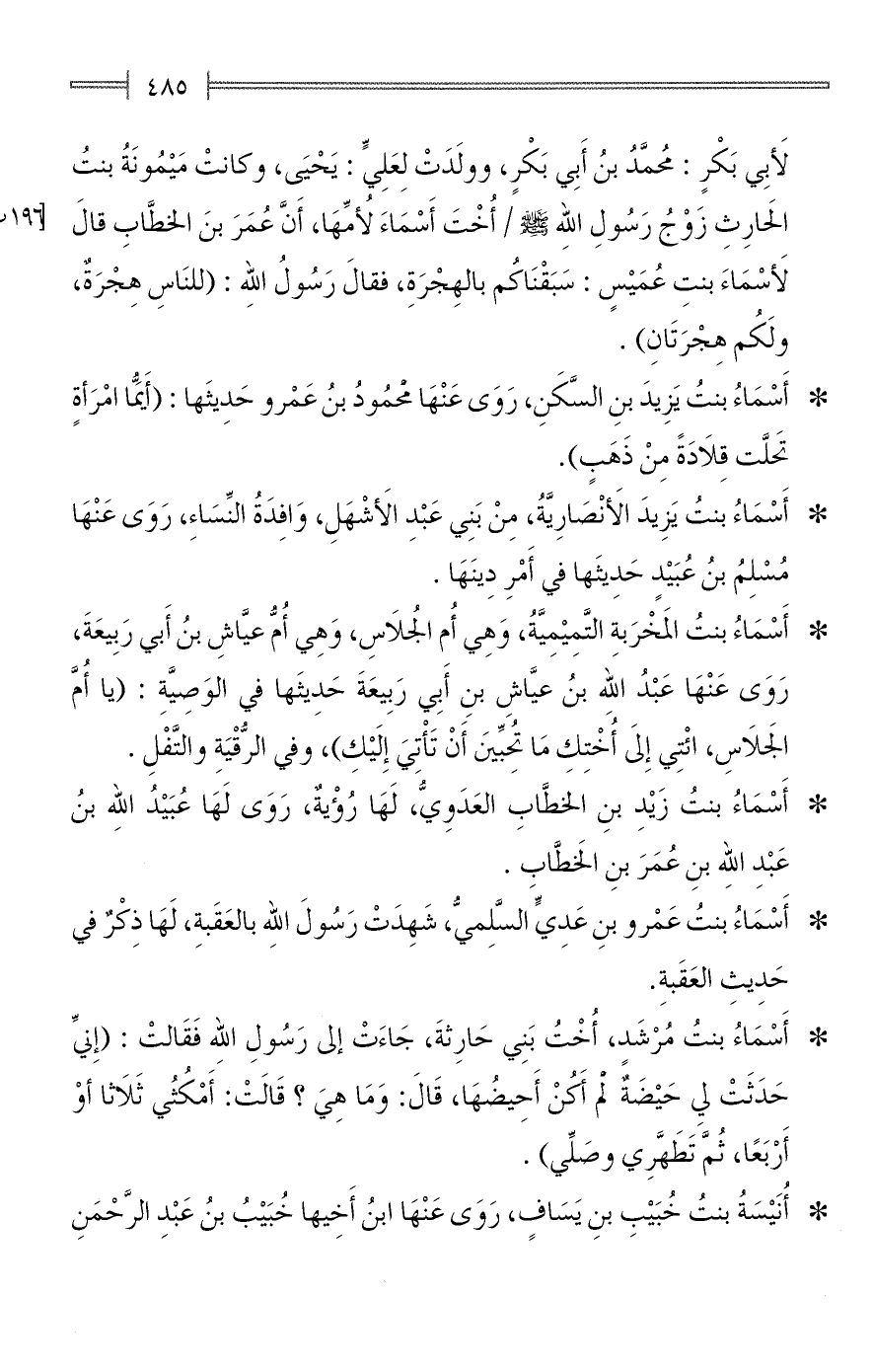 * أَسْمَاءُ بنتُ يَزِيدَ بنِ السَّكَنِ، رَوَى عَنْهَا محْمُودُ بنُ عَمْرو حَدِيثَها: (أَيُّما امْرَأةٍ تحَلَّت قِلَادَةً مِنْ ذَهَبٍ).