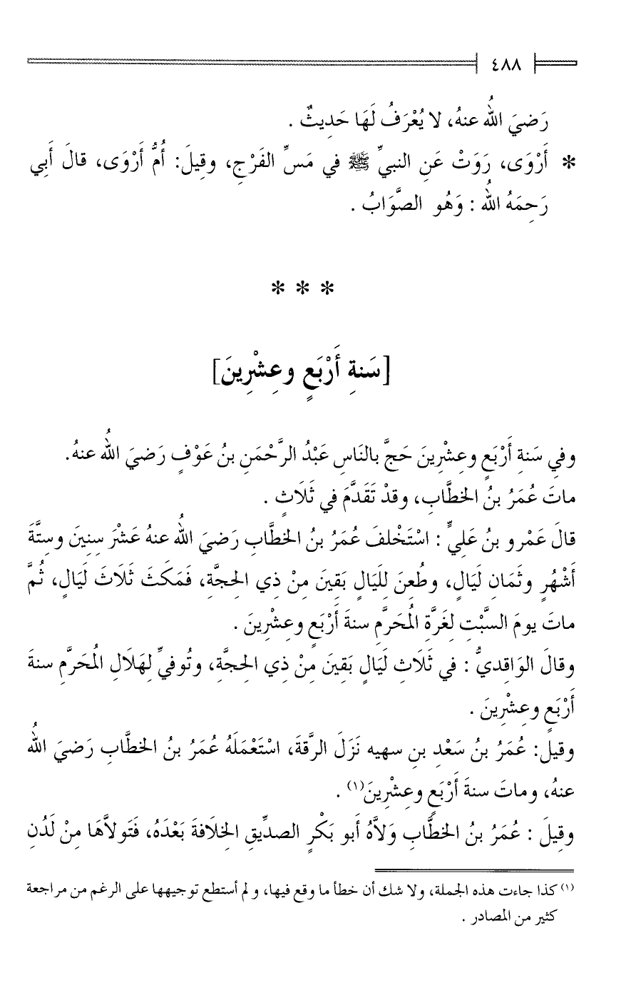 وفيِ سَنةِ أَرْبَعٍ وعِشْرِينَ حَجَّ بالنَّاسِ عَبْدُ الرَّحْمَنِ بنُ عَوْفٍ رَضىَ الله عنهُ. ماتَ عُمَرُ بنُ الخطَّابِ، وقدْ تَقَدَّمَ في ثَلَاثٍ.