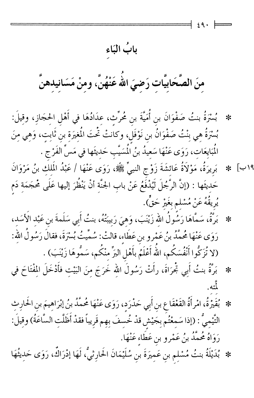 بابُ البَاءِ مِنَ الصَّحَابِيَّاتِ رَضِيَ اللهُ عَنْهُنَّ، ومِنْ مَسَانِيدِهنَّ