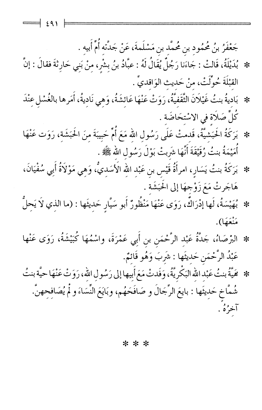 * بَرَكَةُ الحَبَشِيَّةُ، قَدِمتْ عَلَى رَسُولِ الله مَعَ أُمِّ حَبِيبَةَ مِنَ الحَبَشَةِ، رَوَت عَنْهَا أُمَيْمَةُ بنتُ رُقَيْقَةَ أَنَّهَا شَرِبَتْ بَوْلَ رَسُولِ اللهِ - صلى الله عليه وسلم -.
