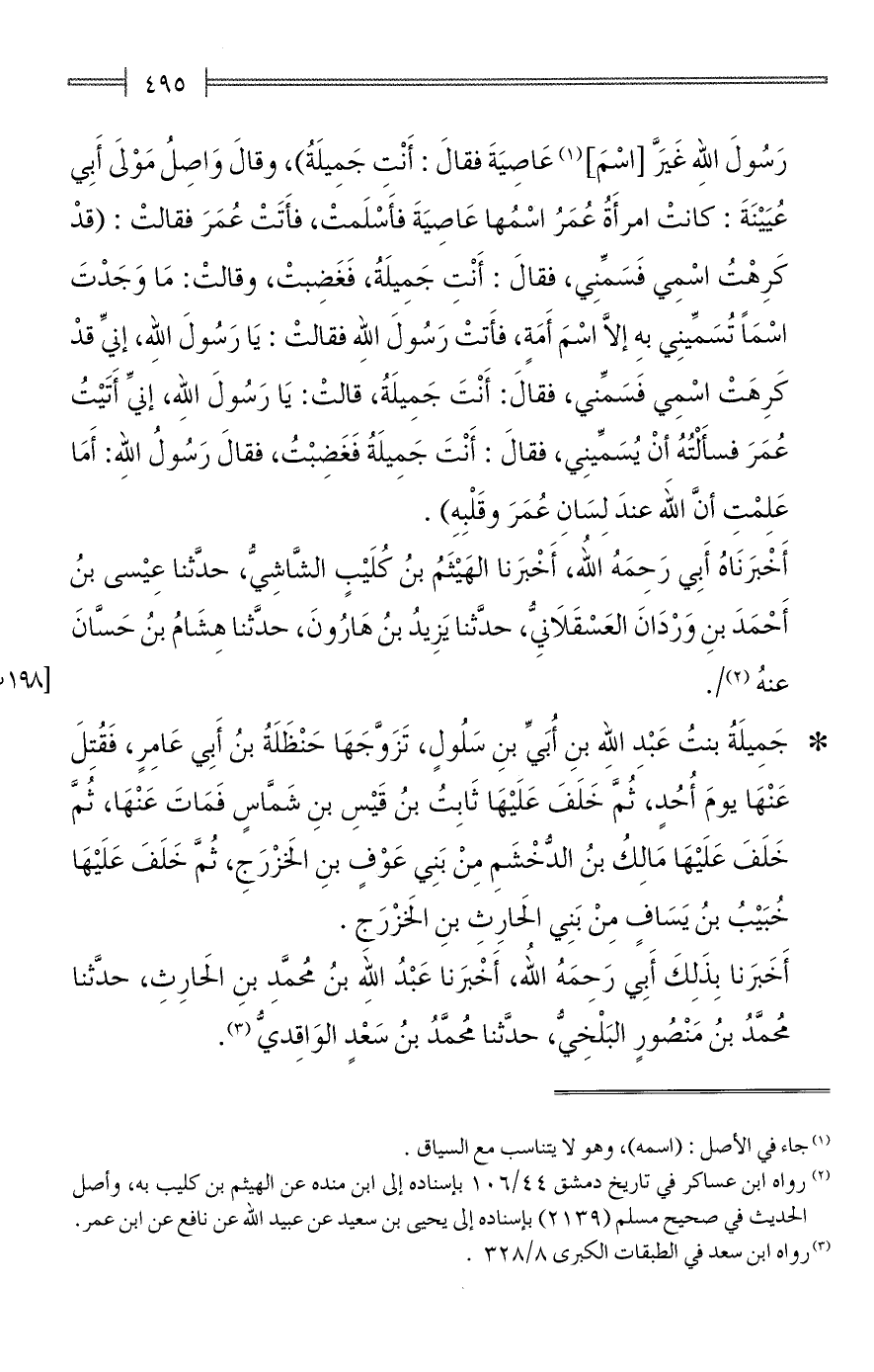 رَسُولَ الله غَيَّرَ [اسْمَ] (¬1) عَاصِيَةَ فقالَ: أَنْتِ جَمِيلَةُ)، وقالَ وَاصِلُ مَوْلَى أَبِي عُيَيْنَةَ: كانت امرأَةُ عُمَرُ اسْمُها عَاصِيَةَ فأَسْلَمتْ، فأَتَتْ عُمَرَ فقالتْ: (قدْ كَرِهْتُ اسْمِي فَسَمِّنِي، فقالَ: أَنْتِ جَمِيلَةُ، فَغَضِبتْ، وقالتْ: مَا وَجَدْتَ اسْمًا تُسَمِّينِي بهِ إلَّا اسْمَ أَمَةٍ، فأَتَتْ رَسُولَ الله فقالتْ: يَا رَسُولَ الله، إنيِّ قدْ كَرِهْتُ اسْمِي فَسَمِّني، فقالَ: أَنْتِ جَمِيلَةُ، قالتْ: يَا رَسُولَ الله، إنيِّ أَتَيْتُ عُمَرَ فسأَلْتُهُ أنْ يُسَمِّينِي، فقالَ: أَنْتَ جَمِيلَةُ فَغَضبْتُ، فقالَ رَسُولُ الله: أَمَا عَلِمْتِ أنَّ الله عندَ لِسَانِ عُمَرَ وقَلْبِهِ).