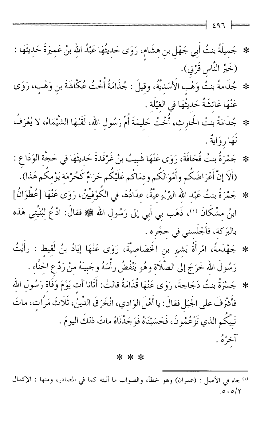 * جَسْرَةُ بنتُ دَجَاجةَ، رَوَى عَنْهَا قُدَامَةُ قالتْ: أَتَانا آتٍ يَوْمَ وَفَاةِ رَسُولِ اللهِ فأَشْرَفَ على الجَبَلِ فقالَ: يا أَهْلَ الوَادِي، انْخَرَقَ الدِّينُ، ثَلَاثَ مَرَّاتٍ، ماتَ نَبِيِّكُم الذي تَزْعُمُونَ، فَحَسَبْنَاهُ فَوَجَدْنَاهُ ماتَ ذلكَ اليومَ.