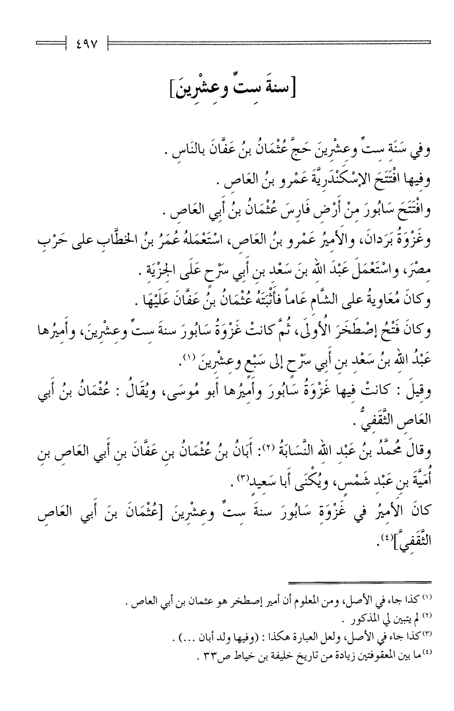 كانَ الأَمِيرُ في غَزْوَةِ سَابُورَ سنةَ سِتِّ وعِشْرِينَ [عُثْمَانَ بنَ أَبي العَاصِ الثَّقَفِيَّ] (¬4).