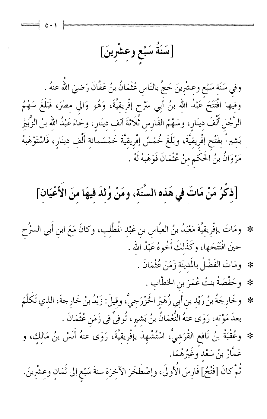 وفيها افْتَتَحَ عَبْدُ الله بنُ أَبِي سَرْحٍ إفْرِيقِيَّةَ، وَهُو وَالِي مِصْرَ، فَبَلَغَ سَهْمُ الرَّجُلِ أَلْفَ دِينَارٍ، وسَهْمُ الفَارِسِ ثَلَاثةَ ألفِ دِينَارٍ، وجَاءَ عَبْدُ اللهِ بنُ الزُّبَيْرِ بَشِيرًا بِفَتْحِ إفْرِيقِيَّةَ، وبَلَغَ خُمْسُ إفْرِيقِيَّةَ خَمْسَمائةِ أَلْفِ دِينَارٍ، فَاسْتَوْهَبهُ مَرْوَانُ بنُ الحَكَمِ مِنْ عُثْمَانَ فَوَهَبهُ لَهُ.