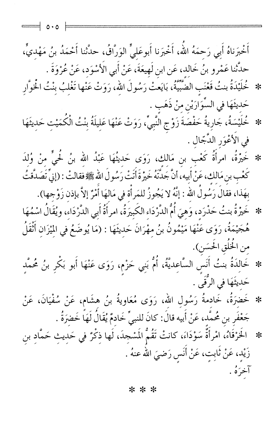* خَالِدَةُ بنتُ أَنَسٍ السَّاعِديَّةُ، أُمُّ بَنِي حَزْمٍ، رَوَى عَنْهَا أَبو بَكْرِ بنُ مُحمَّدٍ حَدِيثَهَا في الرُّقَى.