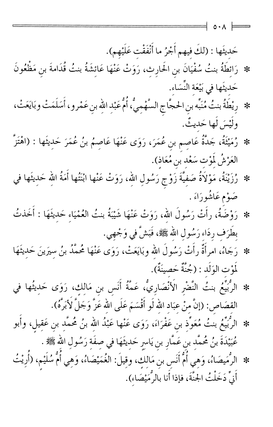 * الرُّبَيِّعُ بنتُ مُعَوِّذِ بنِ عَفْرَاءَ، رَوَى عَنْها عَبْدُ الله بنُ مُحمَّدِ بنِ عَقِيلٍ، وأَبو عُبَيْدَةَ بنُ مُحمَّدِ بنِ عَمَّارِ بنِ يَاسِرٍ حَدِيثَهَا في صِفَةِ رَسُولِ اللهِ - صلى الله عليه وسلم -.