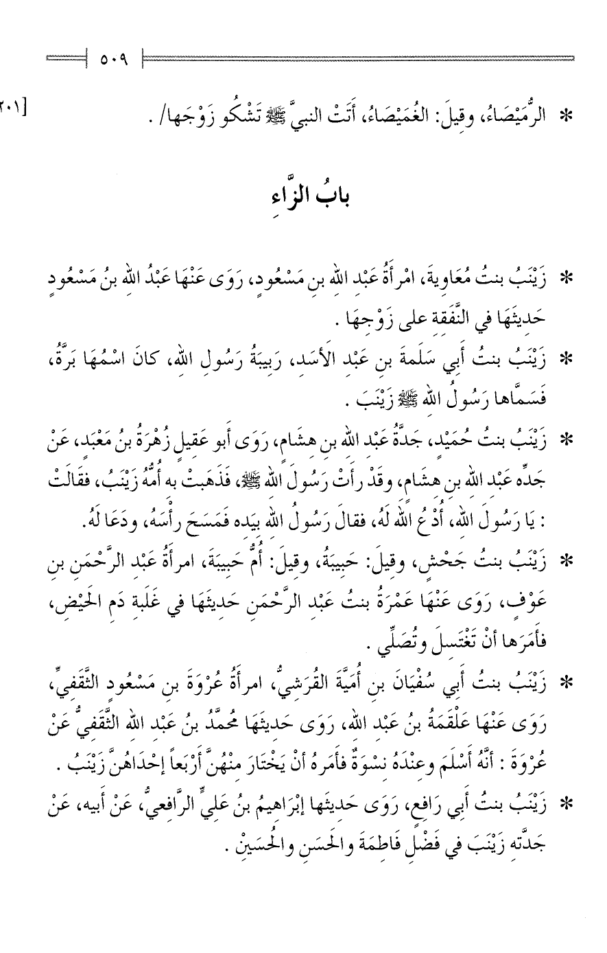 * زَيْنَبُ بنتُ جَحْشٍ، وقِيلَ: حَبِيبَةُ، وقِيلَ: أُمُّ حَبِيبَةَ، امرأَةُ عَبْدِ الرَّحْمَنِ بنِ عَوْفٍ، رَوَى عَنْهَا عَمْرَةُ بنتُ عَبْدِ الرَّحْمَنِ حَدِيثَهَا في غَلَبةِ دَمِ الحَيْضِ، فأَمَرَها أنْ تَغْتَسِلَ وتُصَلِّي.