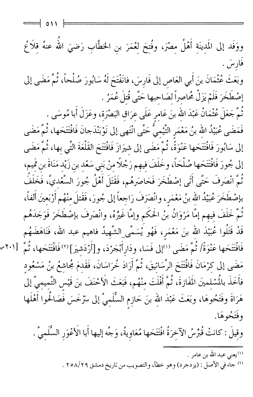 فَمَضَى عُبَيْدُ اللهِ بنُ مَعْمَرٍ التَّيْمِيُّ حَتَّى انْتَهى إلى نَوْبَنْدَجانَ فَافْتَتَحَها، ثُمَّ مَضى إلى سَابُورَ فَافْتَتَحَها عَنْوَةً، ثُمَّ مَضَى إلى شِيرَازَ فَافْتَتَحَ القَلْعَةَ التِّي بِها، ثُمَّ مَضَى إلى جُورَ فَافْتَتَحَها صُلْحًا، وخَلَفَ فِيهِم رَجُلًا مِنْ بَنِي سَعْدِ بنِ زَيْدِ مَنَاةَ بنِ تَمِيمٍ، ثُمَّ انْصَرفَ حَتَّى أَتَى إصْطَخَرَ فَحَاصَرهُم، فَقَتَلَ أَهْلُ جُورَ السَّعْدِيَّ، فَخَلَفَ بإصْطَخَرَ عُبَيْدُ اللهِ بنُ مَعْمَرٍ، وانْصَرَفَ رَاجِعًا إلى جُورَ، فَقَتلَ مِنْهُم أَرْبَعِينَ أَلفًا، ثُمَّ خَلَفَ فِيهِم إمَّا مَرْوَانُ بنُ الحَكَمِ وإمَّا غَيرُهُ، وانْصَرفَ بإصطَخَرَ فَوَجَدَهُم قَدْ قَتَلُوا عُبَيْدَ الله بنَ مَعْمَرٍ، فَهُو يُسَمَّى الشَّهِيدُ فاهيم عبد الله، فَنَاهَضَهُم فَافْتَتَحَها عَنْوَةً ثُمَّ مَضَى (¬1) إلى فَسَا، ودَار أَبْجَرْدَ، و [أَرْدَشِيرَ] (¬2) فَافْتَتَحَها، ثُمَّ مَضَى إلى كِرْمَانَ فَافْتَتَحَ الرَّسَاتِيقَ، ثُمَّ أَرَادَ خُرَاسَانَ، فَقَدِمَ مُجاشِعُ بنُ مَسْعُودٍ فأَخَذَ بالمُسْلِمينَ المَفَازةَ، ثُمَّ أَفْلَتَ مِنْهُم، فَبَعَثَ الأَحْنَفَ بنَ قَيْسٍ التَّمِيمِيَّ إلى هَرَاةَ وفَتَحُوهَا، وبَعَثَ عَبْدَ الله بنَ حَازِمٍ السُّلَمِيَّ إلى سَرْخَسَ فَصَالحُوا أَهْلَها وفَتَحُوهَا.