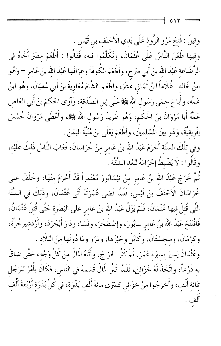 ثمَّ خَرَجَ عَبْدُ الله بنُ عَامِرٍ مِنْ نَيْسَابُورَ مُعْتَمِرًا قَدْ أَحْرَمَ مِنْهَا، وخَلَفَ على خُرَاسَانَ الأَحْنَفَ بنَ قَيْسٍ، فَلَمَّا قَضَى عُمْرَتَهُ أَتَى عُثْمَانَ، وذَلِكَ في السَّنَةِ التِّي قُتِلَ فِيها عُثْمَانُ، فَلَمْ يَزَلْ عَبْدُ اللهِ بنُ عَامِرٍ على البَصْرَةِ حَتَّى قُتِلَ عُثْمَانُ، فَافْتَتَحَ عَبْدُ اللهِ بنُ عَامِرٍ سَابُورَ، وإصْطَخَرَ، وفَسَا، ودَارَ أَبْجَرْدَ، وأَرْدَشِير خُرَّةَ، وكِرْمَانَ، وسِجِسْتَانَ، وكَابُلَ وحَيْزَها، ومَرُو ومَا دُونَها مِنَ البلَادِ.