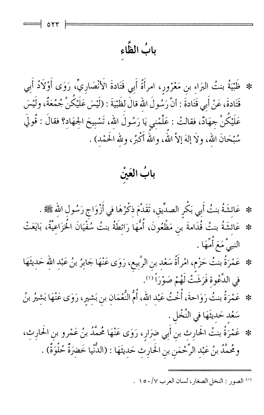 * عَمْرَةُ بنتُ رَوَاحةَ، أُخْتُ عَبْدِ اللهِ، أُمُّ النُّعْمَانِ بنِ بَشِيرٍ، رَوَى عَنْهَا بَشِيرُ بنُ سَعْدٍ حَدِيثَهَا في النَّخْلِ.