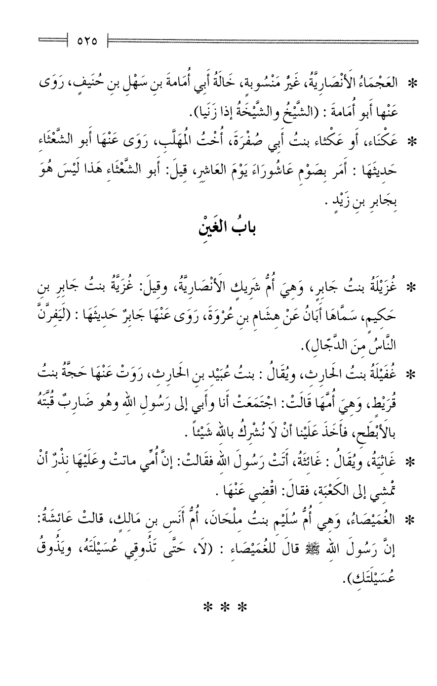 * الغُمَيْصَاءُ، وَهِي أُمُّ سُلَيْمِ بنتُ مِلْحَانَ، أُمُّ أَنَسِ بنِ مَالِكٍ، قالتْ عَائِشَةُ: إنَّ رَسُولَ اللهِ - صلى الله عليه وسلم - قالَ للغُمَيْصاءِ: (لَا، حَتَّى تَذُوقِي عُسَيْلَتَهُ، ويَذُوقُ عُسَيْلَتَكِ).