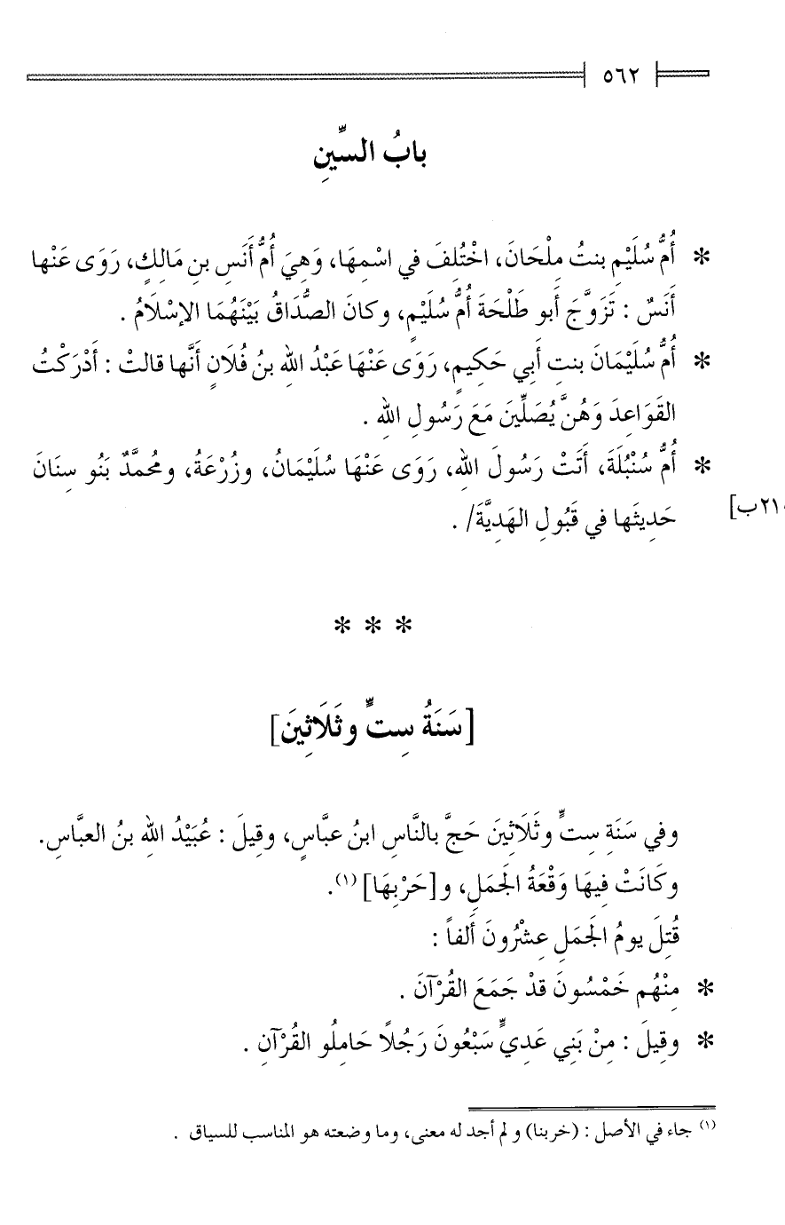 * أُمُّ سُلَيْمِ بنتُ مِلْحَانَ، اخْتُلِفَ في اسْمِهَا، وَهيَ أُمُّ أَنَسِ بنِ مَالِكٍ، رَوَى عَنْها أَنَسٌ: تَزَوَّجَ أَبو طَلْحَةَ أُمُّ سُلَيْمٍ، وكانَ الصَّدَاقُ بَيْنَهُمَا الإسْلَامُ.