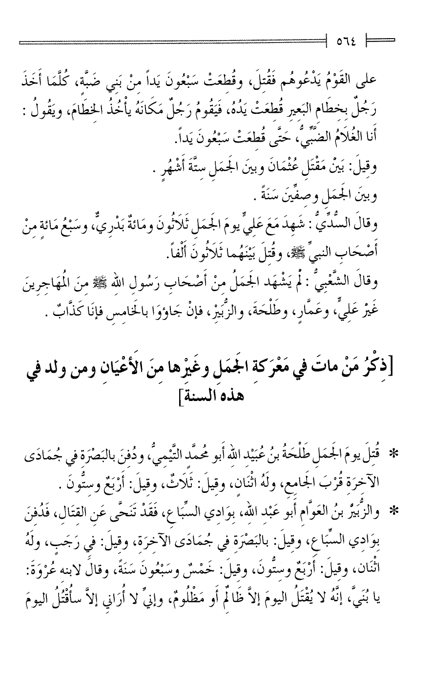 * قُتِلَ يومَ الجَمَلِ طَلْحَةُ بنُ عُبَيْدِ اللهِ أَبو مُحمَّدٍ التَّيْمِيُّ، ودُفِنَ بالبَصْرَةِ في جُمَادَى الآخِرَةِ قُرْبَ الجَامِعِ، ولَهُ اثْنَانٍ، وقِيلَ: ثَلَاثٌ، وقِيلَ: أَرْبَعٌ وسِتُّونَ.