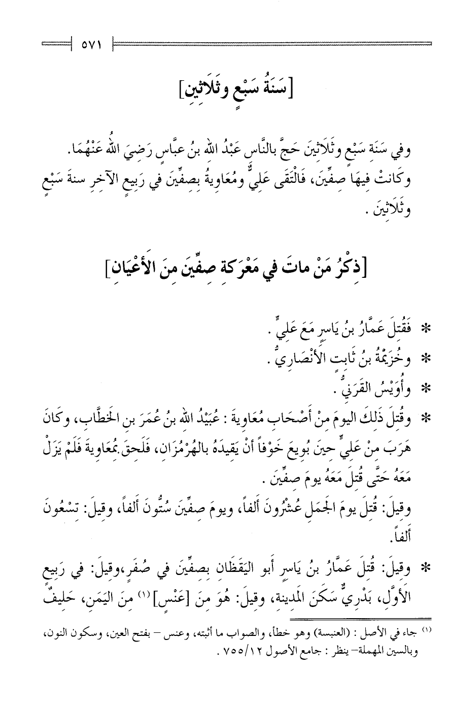 وكَانتْ فِيهَا صِفِّينَ، فَالْتَقَى عَلِيٌّ ومُعَاوِيةُ بِصِفِّينَ في رَبِيعٍ الآخِرِ سنةَ سَبْعٍ وثَلَاثِينَ.