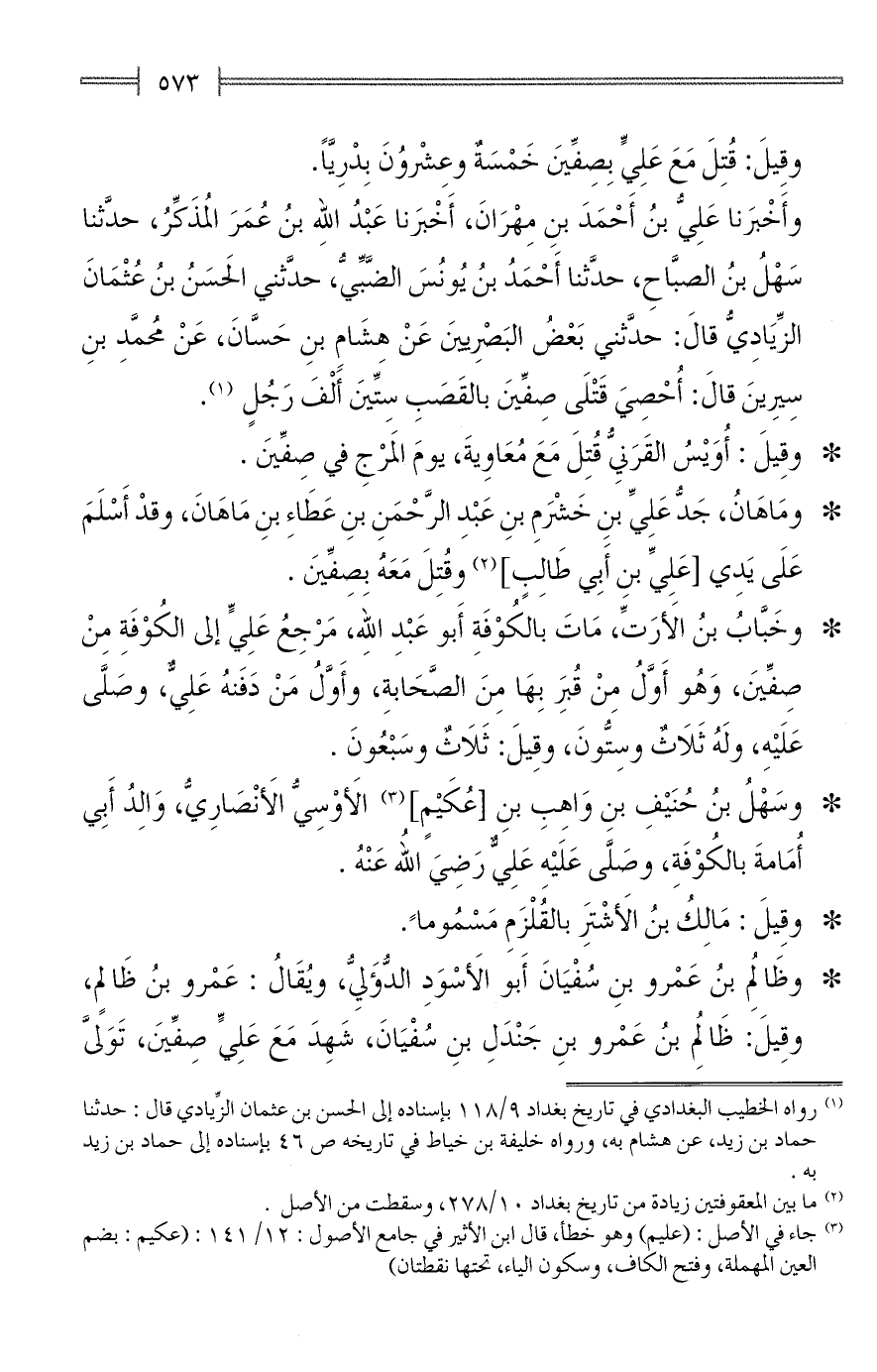 وأَخْبَرنا عَلِيُّ بنُ أَحْمَدَ بنِ مِهْرَانَ، أَخْبَرنا عَبْدُ اللهِ بنُ عُمَرَ المُذَكِّرُ، حدَّثنا سَهْلُ بنُ الصبَّاحِ، حدَّثنا أَحْمَدُ بنُ يُونُسَ الضَّبِّيُّ، حدَّثني الحَسَنُ بنُ عُثْمَانَ الزِّيَادِيُّ قالَ: حدَّثني بَعْضُ البَصْرِيينَ عَنْ هِشَامِ بنِ حَسَّانَ، عَنْ مُحمَّدِ بنِ سِيِرينَ قالَ: أُحْصِيَ قَتْلَى صِفِّينَ بالقَصَبِ سِتِّينَ أَلْفَ رَجُلٍ (¬1).