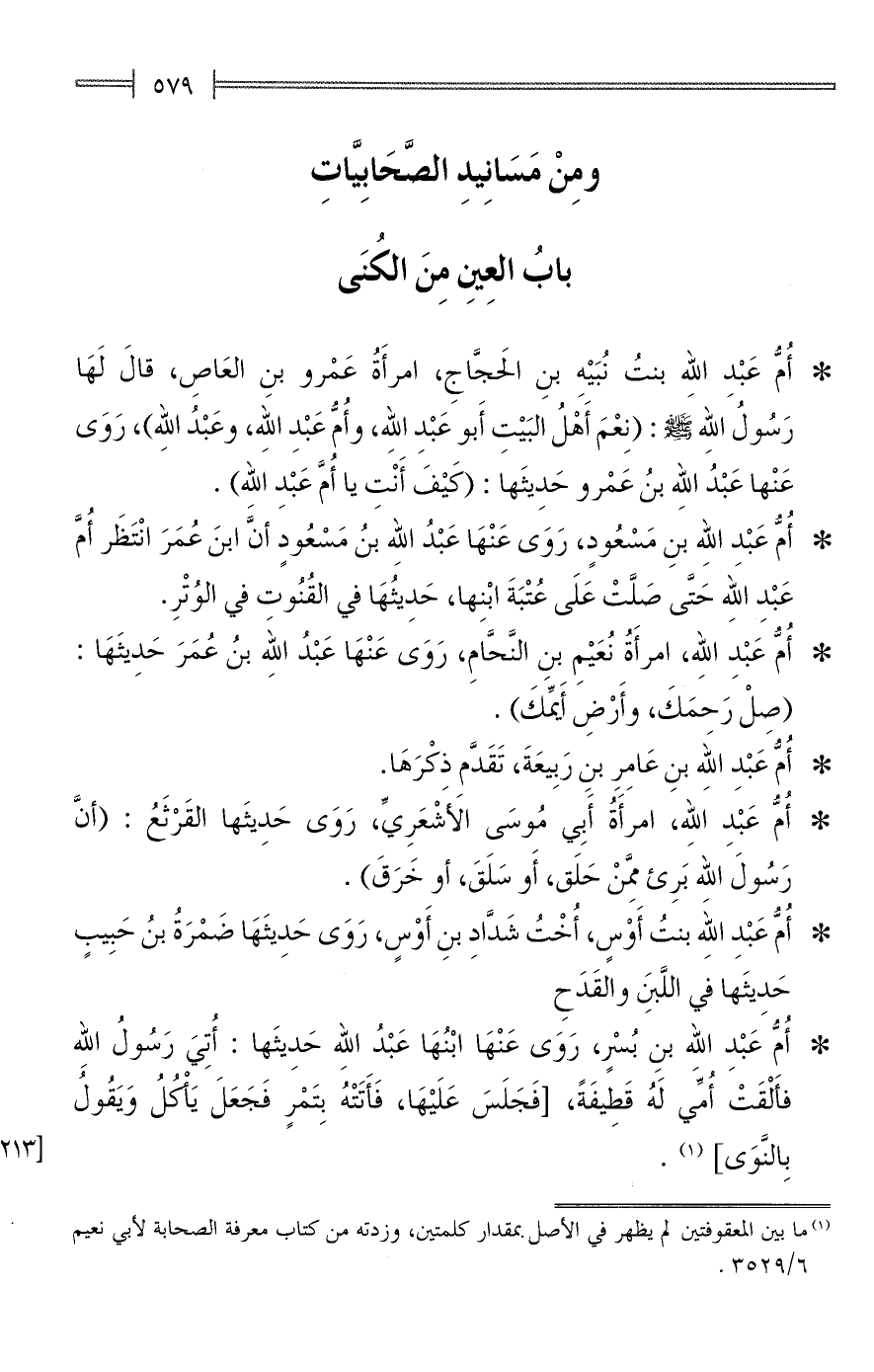 ومِنْ مَسَانِيدِ الصَّحَابِيَّاتِ بابُ العِينِ مِنَ الكُنَى