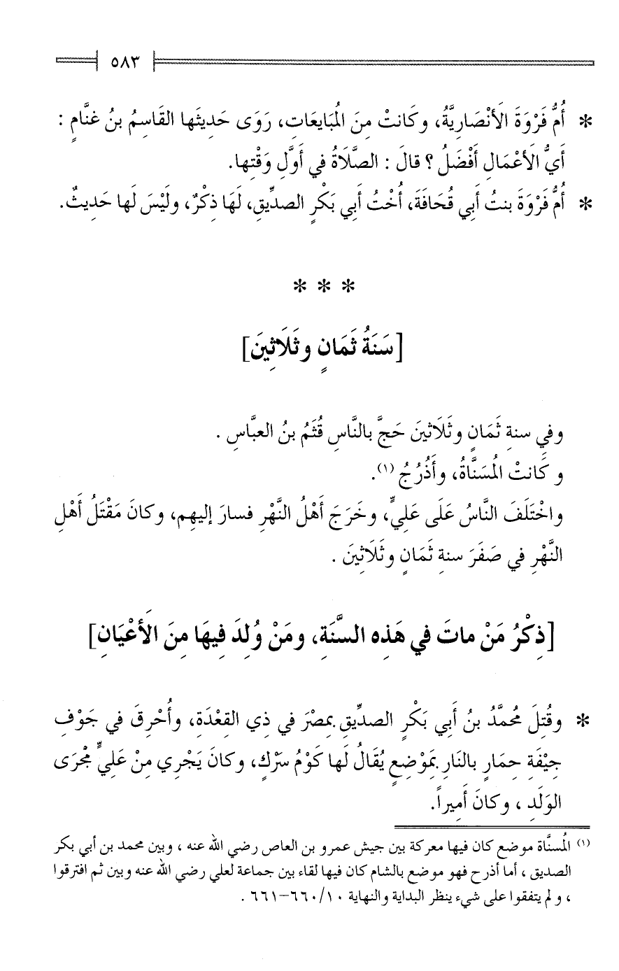 * وقُتِلَ مُحمَّدُ بنُ أَبِي بَكْرٍ الصدِّيقِ بمِصْرَ في ذِي القِعْدَةِ، وأُحْرِقَ في جَوْفِ جِيْفَةِ حِمَارٍ بالنَارِ بِمَوْضِعٍ يُقَالُ لَها كَوْمُ سَرْكٍ، وكانَ يَجْرِي مِنْ عَلِيٍّ مجْرَى الوَلَدِ، وكانَ أَمِيرًا.
