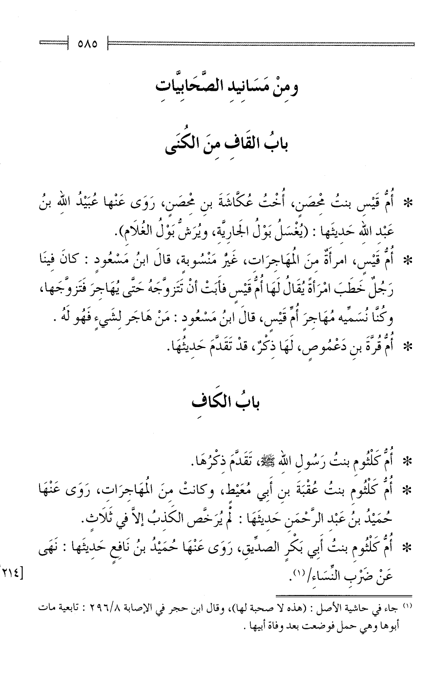 * أُمُّ كَلْثُومِ بنتُ أَبِي بَكْرٍ الصدِّيقِ، رَوَى عَنْهَا حُمَيْدُ بنُ نَافِعِ حَدِيثَها: نَهَى عَنْ ضَرْبِ النِّسَاءِ (¬1).