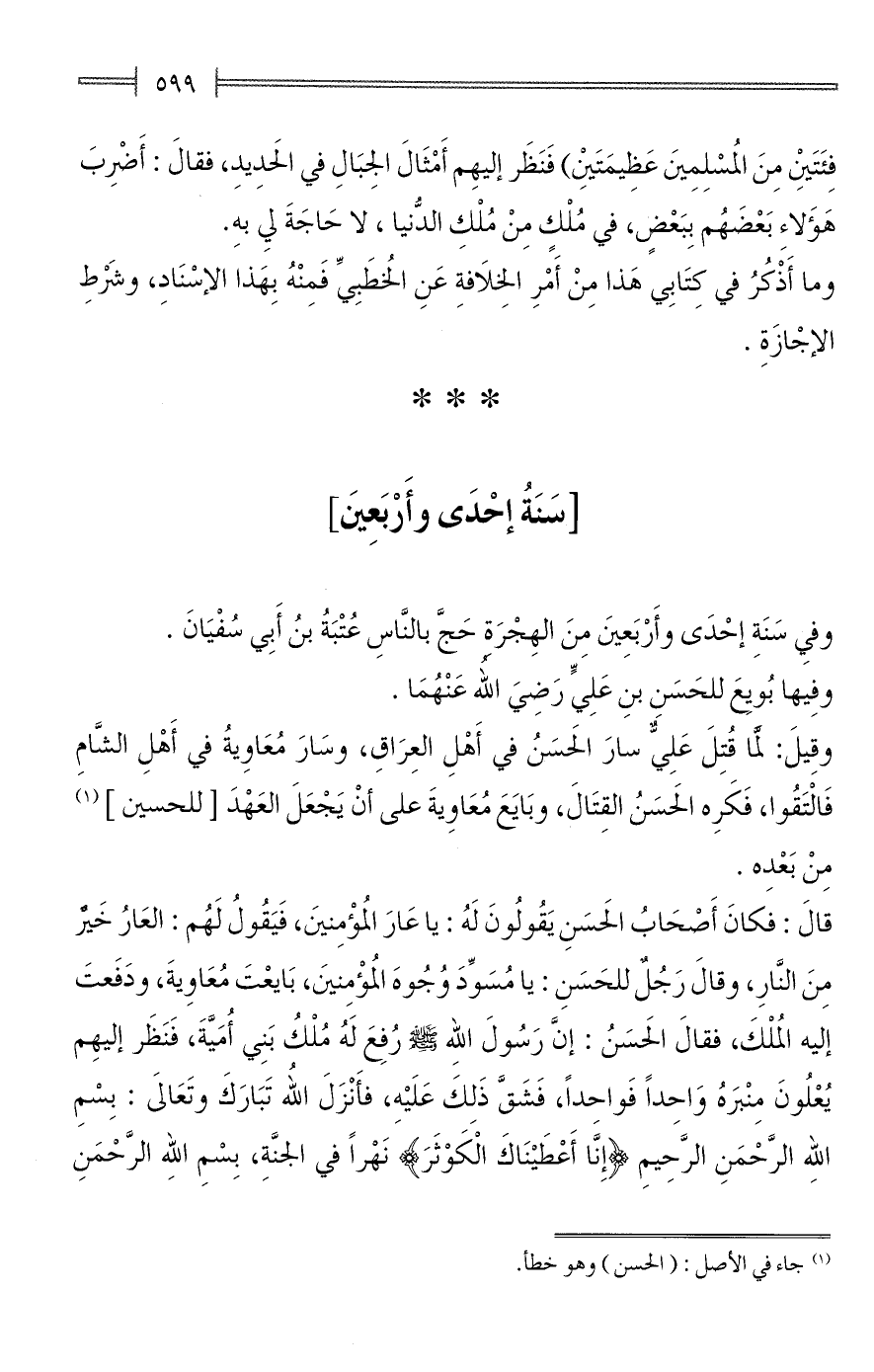 قالَ: فكانَ أَصحَابُ الحَسَنِ يَقُولُونَ لَهُ: يا عَارَ المُؤْمِنينَ، فَيَقُولُ لَهُم: العَارُ خَير مِنَ النَّارِ، وقالَ رَجُلٌ للحَسَنِ: يا مُسَوِّدَ وُجُوهَ المُؤْمِنينَ، بَايعْتَ مُعَاوِيةَ، ودَفَعتَ إليه المُلْكَ، فقالَ الحَسَنُ: إنَّ رَسُولَ اللهِ - صلى الله عليه وسلم - رُفِعَ لَهُ مُلْكُ بَنِي أُمَيَّةَ، فَنَظَر إليهِم يُعْلُونَ مِنْبَرهُ وَاحِدًا فَواحِدًا، فَشَقَّ ذَلِكَ عَلَيْه، فأَنْزَلَ الله تَبَارَكَ وتَعَالىَ: بِسْمِ اللهِ الرَّحْمَنِ الرَّحِيمِ {إِنَّا أَعْطَيْنَاكَ الْكَوْثَرَ} نَهْرًا في الجنَّةِ، بِسْمِ الله الرَّحْمَنِ
