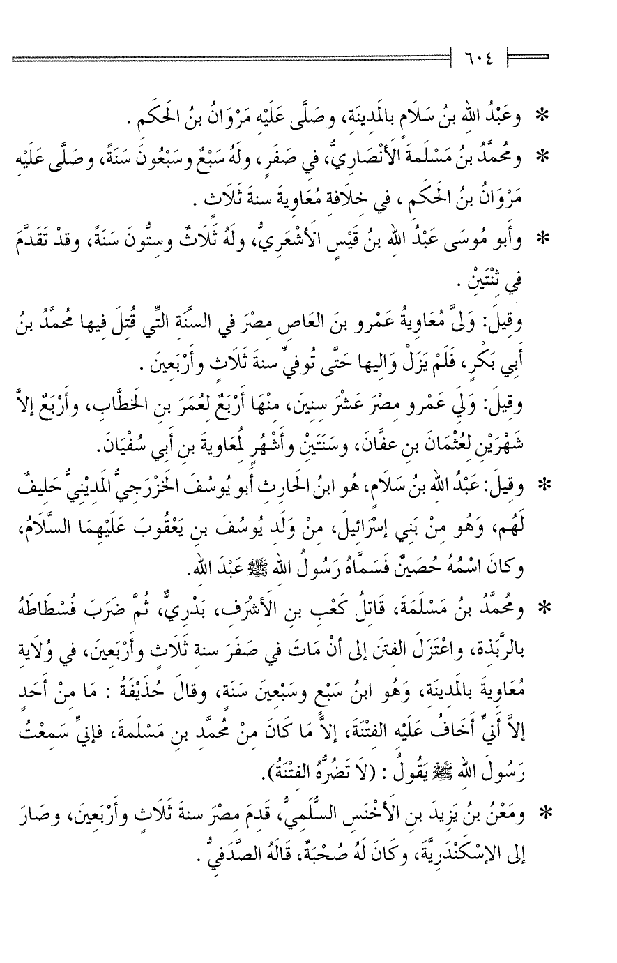 * ومُحمَّدُ بنُ مَسْلَمَةَ، قَاتِلُ كَعْبِ بنِ الأشْرَفِ، بَدْرِيُّ، ثُمَّ ضَرَبَ فُسْطَاطَهُ بالرَّبَذِة، واعْتَزَلَ الفِتنَ إلى أنْ مَاتَ في صَفَرَ سنةِ ثَلَاثٍ وأَرْبَعِينَ، في وُلَايةِ مُعَاوِيةَ بالمَدِينَةِ، وَهُو ابنُ سَبْعٍ وسَبْعِينَ سَنَةٍ، وقالَ حُذَيْفَةُ: مَا مِنْ أَحَدٍ إلَّا أَنِّي أَخَافُ عَلَيْهِ الفِتْنَةَ، إلَّا مَا كَانَ مِنْ مُحمَّدِ بنِ مَسْلَمةَ، فإنيِّ سَمِعْتُ رَسُولَ اللهِ - صلى الله عليه وسلم - يَقُولُ: (لَا تَضُرُّهُ الفِتْنَةُ).