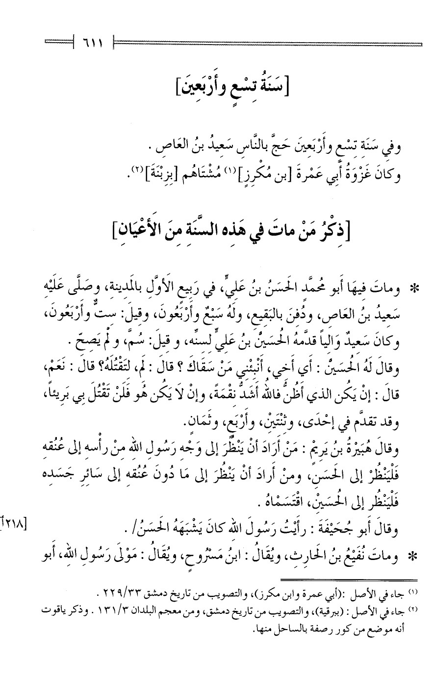 * وماتَ فِيهَا أَبو مُحمَّدٍ الحَسَنُ بنُ عَلِيٍّ، في رَبِيعٍ الأَوَّلِ بالمَدِينةِ، وصَلَّى عَلَيْهِ سَعِيدُ بنُ العَاصِ، ودُفِنَ بالبَقِيعِ، ولَهُ سَبْعٌ وأَرْبَعُونَ، وقِيلَ: سِتٌّ وأَرْبَعُونَ، وكانَ سَعِيدٌ وَاليًا قدَّمهُ الحُسَين بنُ عَلِيٍّ لِسِنِّه، وقِيلَ: سُمَّ، ولمْ يَصِحّ.