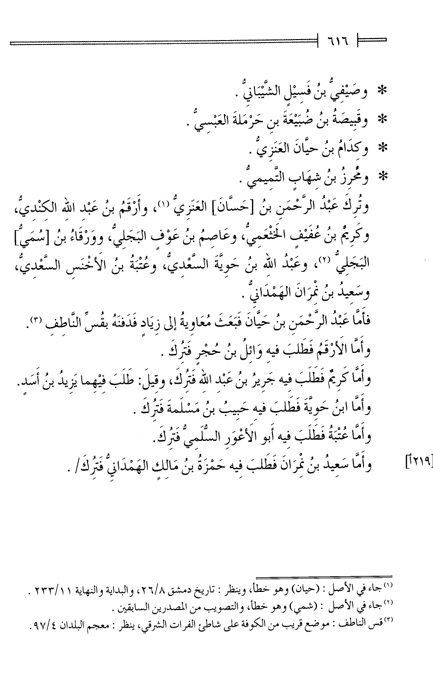 وتُرِكَ عَبْدُ الرَّحْمَنِ بنُ [حَسَّانَ] العَنَزِيُّ (¬1)، وأَرْقَمُ بنُ عَبْدِ اللهِ الكِنْدِيُّ، وكَرِيْمُ بنُ عُفَيْفٍ الخَثْعَمِيُّ، وعَاصِمُ بنُ عَوْفٍ البَجَلِيُّ، ووَرْقَاءُ بنُ [سُمَيُّ] البَجَلِيُّ (¬2)، وعَبْدُ الله بنُ حَوِيَّةَ السَّعْدِيُّ، وعُتْبَةُ بنُ الأَخْنَسِ السَّعْدِيُّ، وسَعِيدُ بنُ نِمرَان الهَمْدَانِيُّ.