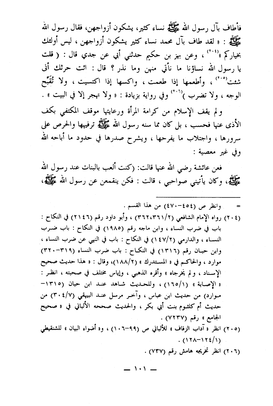 فأطاف بآل رسول الله صلى الله عليه وسلم نساء كثير، يشكون أزواجهن، فقال رسول الله صلى الله عليه وسلم: " لقد طاف بآل محمد نساء كثير يشكون أزواجهن، ليس أولئك بخياركم) (204) ، وعن بهز بن حكيم حدثني أبي عن جدي قال: (قلت يا رسول الله نساؤنا ما نأتي منهن وما نذر؟ قال: ائت حرثك أنى شئت (205) ، وأطعمها إذا طعمت، واكسها إذا اكتسيت، ولا تُقَبح الوجه، ولا تضرب) (206) وفي رواية بزيادة: " ولا تهجر إلا في البيت".
