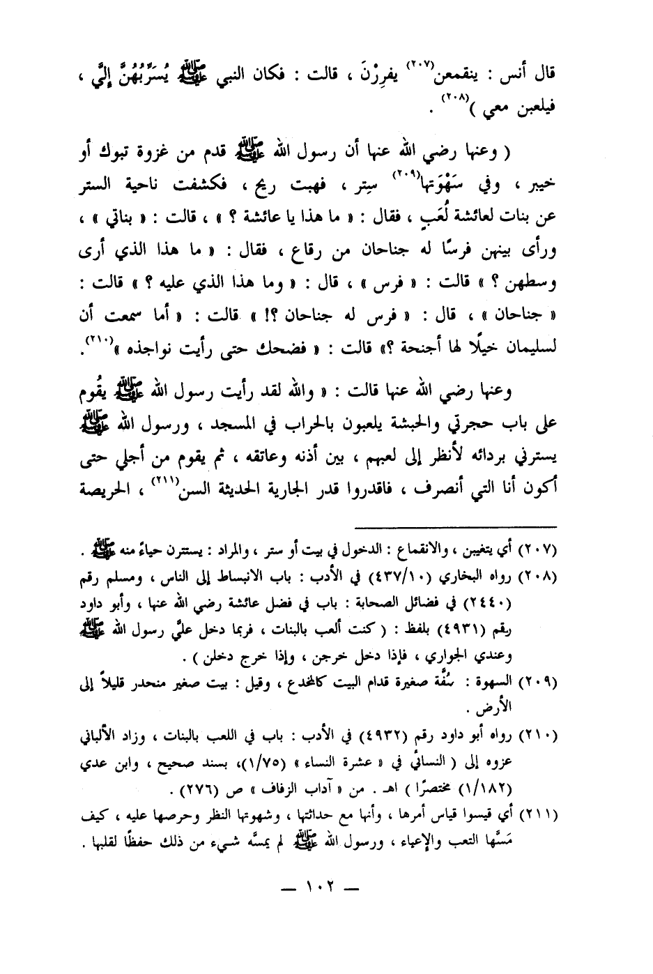 (208) رواه البخاري (10/437) في الأدب: باب الانبساط إلى الناس، ومسلم رقم (2440) في فضائل الصحابة: باب في فضل عائشة رضي الله عنها، وأبو داود رقم (4931) بلفظ: (كنت ألعب بالبنات، فربما دخل علي رسول الله صلى الله عليه وسلم وعندي الجواري، فإذا دخل خرجن، وإذا خرج دخلن) .