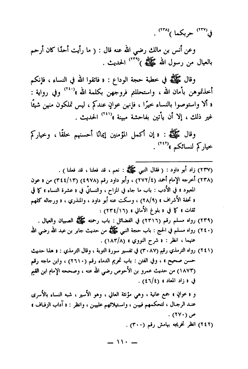 وقال صلى الله عليه وسلم في خطبة حجة الوداع: " فاتقوا الله في النساء، فإنكم أخذتموهن بأمان الله، واستحللتم فروجهن بكلمة الله، (240) وفي رواية: (ألا واستوصوا بالنساء خيرَا، فإنهن عوان عندكم، ليس تملكون منهن شيئا غير ذلك، إلا أن يأتين بفاحشة مبينة" (241) الحديث.