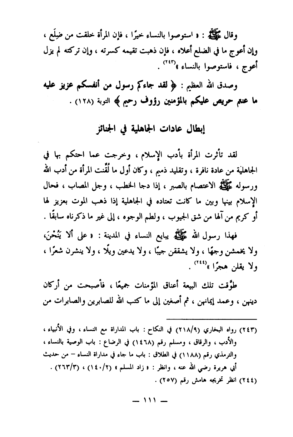 فهذا رسول الله صلى الله عليه وسلم يبايع النساء في المدينة: " على ألا يَنُحْنَ، ولا يخمشن وجهًا، ولا يشققن جيبًا، ولا يدعين ويلًا، ولا ينشرن شعرا، ولا يقلن هجرا " (244) .