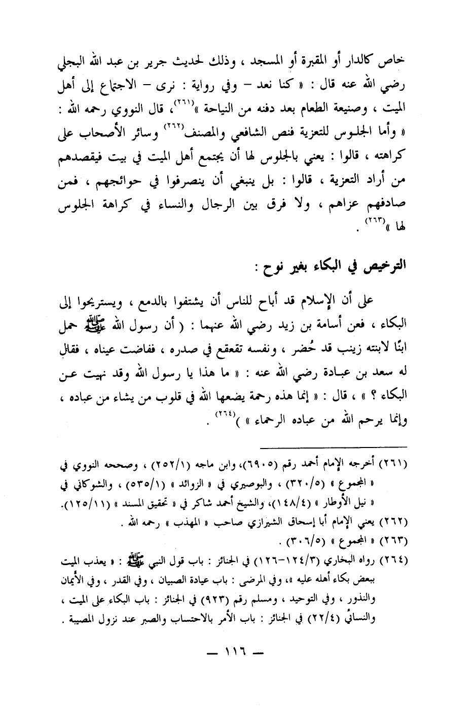 (264) رواه البخاري (3/124 -126) في الجنائز: باب قول النبي صلى الله عليه وسلم: "يعذب الميت ببعض بكاء أهله عليه "، وفي المرضى: باب عادة الصبيان، وفي القدر، وفي الإيمان والنذور، وفي التوحيد، ومسلم رقم (923) في الجنائز: باب البكاء على الميت، والنسائي (4/22) في الجنائز: باب الأمر بالاحتساب والصبر عند نزول المصيبة.