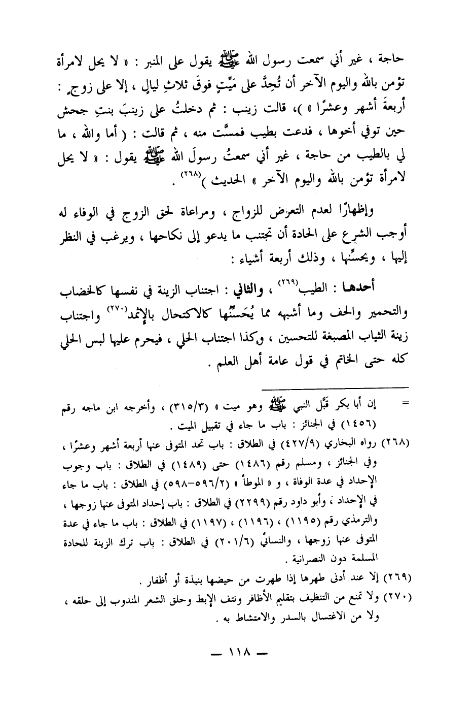 (268) رواه البخاري (9/427) في الطلاق: باب تحد المتوفى عنها أربعة أشهر وعشرا، وفي الجنائز، ومسلم رقم (1486) حتى (1489) في الطلاق: باب وجوب الإحداد في عدة الوفاة، و" الموطأ" (2/596-598) في الطلاق: باب ما جاء في الإحداد، وأبو داود رقم (2299) في الطلاق: باب إحداد المتوفى عنها زوجها، والترمذي رقم (1195) ، (1196) ، (1197) في الطلاق: باب ما جاء في عدة المتوفى عنها زوجها، والنسائي (6/201) في الطلاق: باب ترك الزينة للحادة المسلمة دون النصرانية.