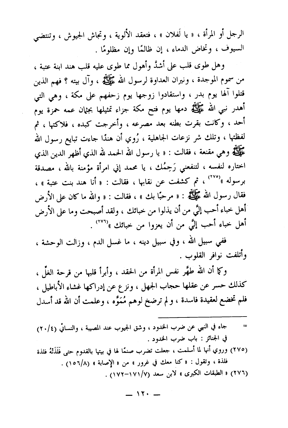 وهل طوى قلب على أشد وأهول مما طوى عليه قلب هند ابنة عتبة، من سموم الموجدة، ونيران العداوة لرسول الله صلى الله عليه وسلم، وآل بيته؟ فهم الذين قتلوا آلها يوم بدر، واستقادوا زوجها يوم زحفهم على مكة، وهي التي أهدر نبي الله صلى الله عليه وسلم دمها يوم فتح مكة جزاء تمثيلها بجثمان عمه حمزة يوم أحد، وكانت بقرت بطنه بعد مصرعه، وأخرجت كبده، فلاكتها، ثم لفظتها، وتلك شر نزعات الجاهلية، رُوي أن هندًا جاءت تبايع رسول الله صلى الله عليه وسلم وهى مقنعة، فقالت: "يا رسول الله الحمد لله الذي أظهر الدين الذي اختاره لنفسه، لتنفعني رَحِمُك، يا محمد أني امرأة مؤمنة بالله، مصدقة برسوله " (527) ، ثم كشفت عن نقابها، فقالت: " أنا هند بنت عتبة"، فقال رسول الله صلى الله عليه وسلم: "مرحبًا بك"، فقالت: "والله ما كان على الأرض أهل خباء أحب إليَّ من أن يذلوا من خبائك، ولقد أصبحت وما على الأرض أهل خباء أحب إليَّ من أن يعزوا من خبائك) (276) .