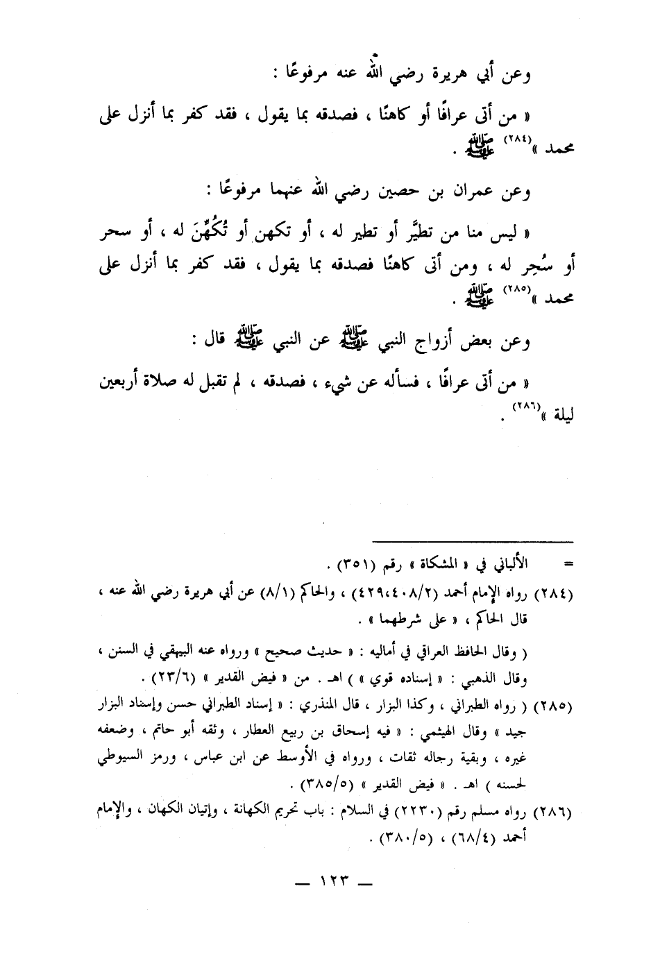 (286) رواه مسلم رقم (2230) في السلام: باب تحريم الكهانة، وإتيان الكهان، والإمام أحمد (4/68) ، (5/0 38) .
