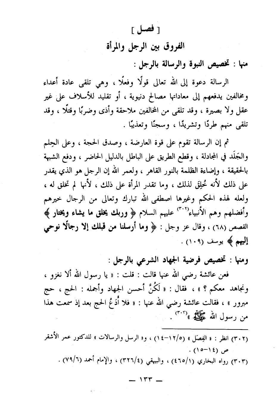 ثم إن الرسالة تقوم على قوة العارضة، وصدق الحجة، وعلى الحِلم والجَلَد في المجادلة، وقطع الطريق على الباطل بالدليل الحاضر، ودفع الشبهة بالحقيقة، وإضاءة الظلمة بالنور القاهر، ولعمر الله إن الرجل هو الذي يقدر على ذلك لأنه خُلِقَ لذلك، وما تقدر المرأة على ذلك، لأنها لم تخلق له، ولعله لهذه الحكم وغيرها اصطفى الله تبارك وتعالى من الرجال خيرهم وأفضلهم وهم الأنبياء (302) عليهم السلام (وربك يخلق ما يشاء ويختار) القصص (68) ، وقال عز وجل: (وما أرسلنا من قبلك إلا رجالًا نوحي إليهم) يوسف (109) .