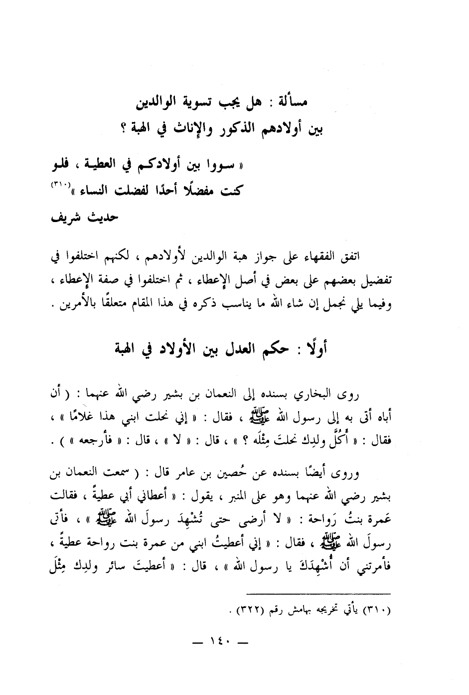 روى البخاري بسنده إلى النعمان بن بشير رضي الله عنهما: (أن أباه أتى به إلى رسول الله صلى الله عليه وسلم، فقال: " إني نحلت ابنى هذا غلامًا "، فقال: " أكُل ولدِك نحلتَ مِثْلَه؟ "، قال: " لا "، قال: " فأرجعه ") .