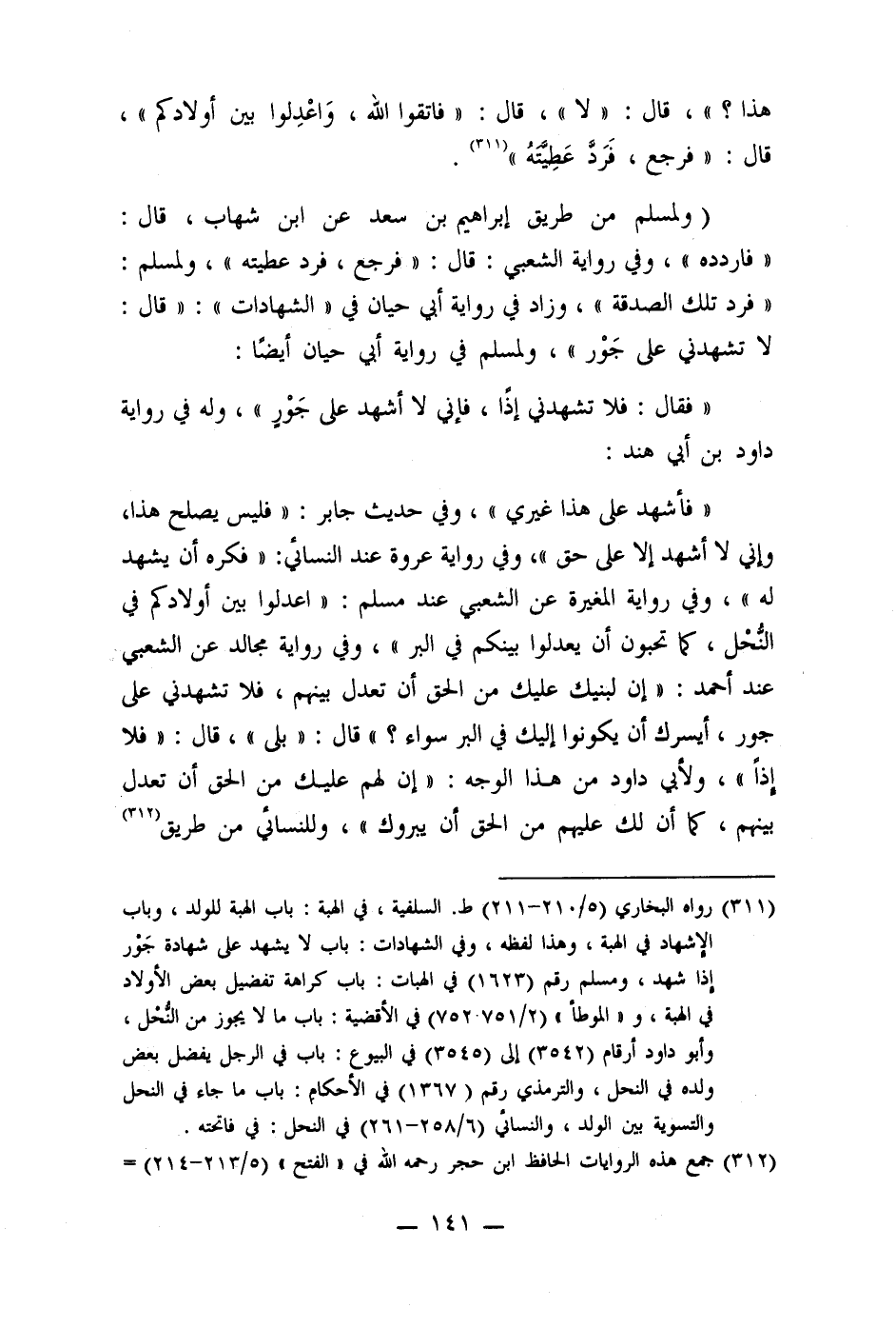 (311) رواه البخاري (5/210 - 211) ط. السلفية، في الهبة: باب الهبة للولد، وباب الإشهاد في الهبة، وهذا لفظه، وفي الشهادات: باب لا يشهد عل شهادة جَوْر إذا شهد، ومسلم رقم (1623) في الهبات: باب كراهة تفضيل بعض الأولاد في الهبة، و " الموطأ " (2/751، 752) في الأقضية: باب ما لا يجوز من النٌّحْل، وأبو داود أرقام (3542) إلى (3545) في البيوع: باب في الرجل يفضل بعض ولده في النحل، والترمذي رقم (1367) في الأحكام: باب ما جاء في النحل والتسوية بين الولد، والنسائي (6/258-261) في النحل: في فاتحته.