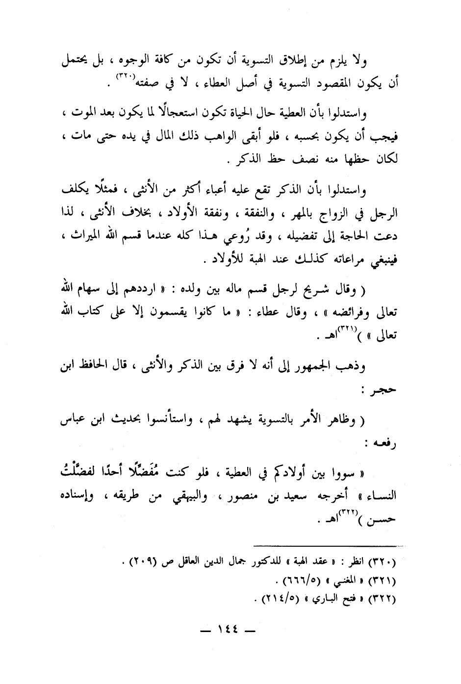 (سووا بين أولادكم في العطية، فلو كنت مُفَضِّلاً أحدا لفضَّلْتُ النساء" أخرجه سعيد بن منصور، والبيهقي من طريقه، وإسناده حسن) (322) اهـ.