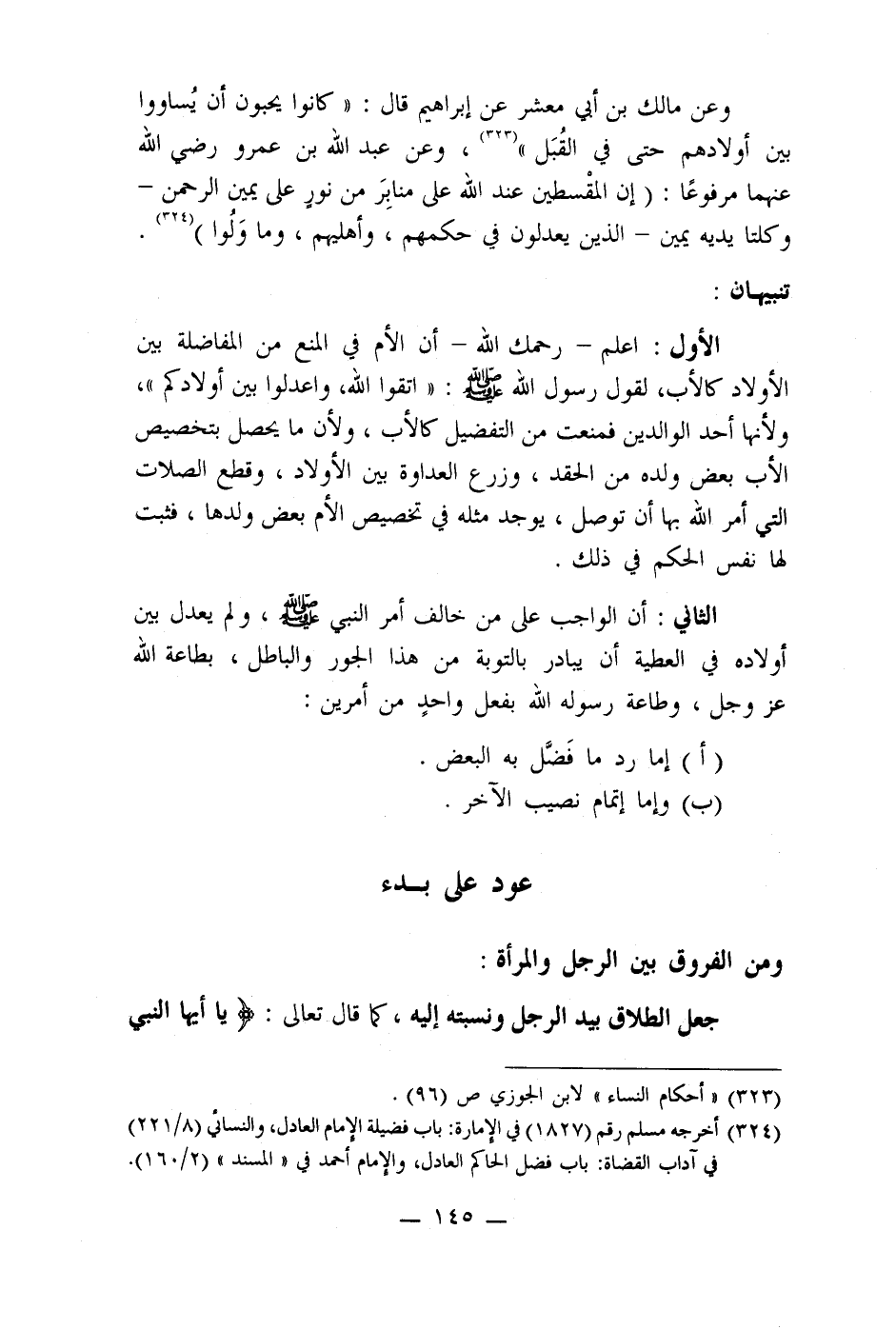 وعن مالك بن أبي معشر عن إبراهيم قال: " كانوا يحبون أن يُساووا بين أولادهم حتى في القُبَل (323) ، وعن عبد الله بن عمرو رضي الله عنهما مرفوعًا: (إن المقْسطين عند الله على منابِرَ من نور على يمين الرحمن - وكلتا يديه يمين - الذين يعدلون في حكمهم، وأهليهم، وما وَلُوا) (324) .