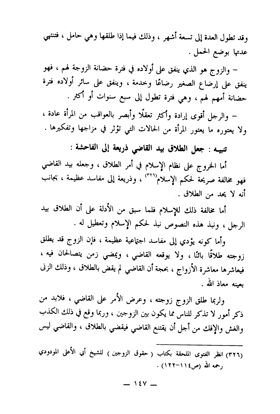 أما الخروج على نظام الإسلام في أمر الطلاق، وجعله بيد القاضي فهو مخالفة صريحة لحكم الإسلام (326) ، وذريعة إلى مفاسد عظيمة، بجانب أنه لا يحد من الطلاق.