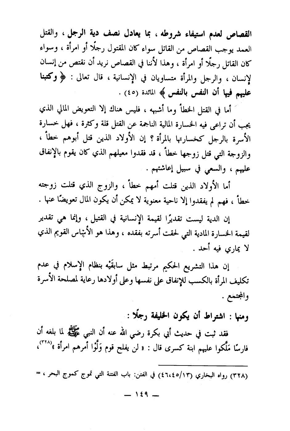 أما في القتل الخطأ وما أشبهه، فليس هناك إلا التعويض المالي الذي يجب أن تراعى فيه الخسارة المالية الناجمة عن القتل قلة وكثرة، فهل خسارة الأسرة بالرجل كخسارتها بالمرأة؟ إن الأولاد الذين قتل أبوهم خطأ، والزوجة التي قتل زوجها خطأ، قد فقدوا معيلهم الذي كان يقوم بالإنفاق عليهم، والسعي في سبيل إعاشتهم.