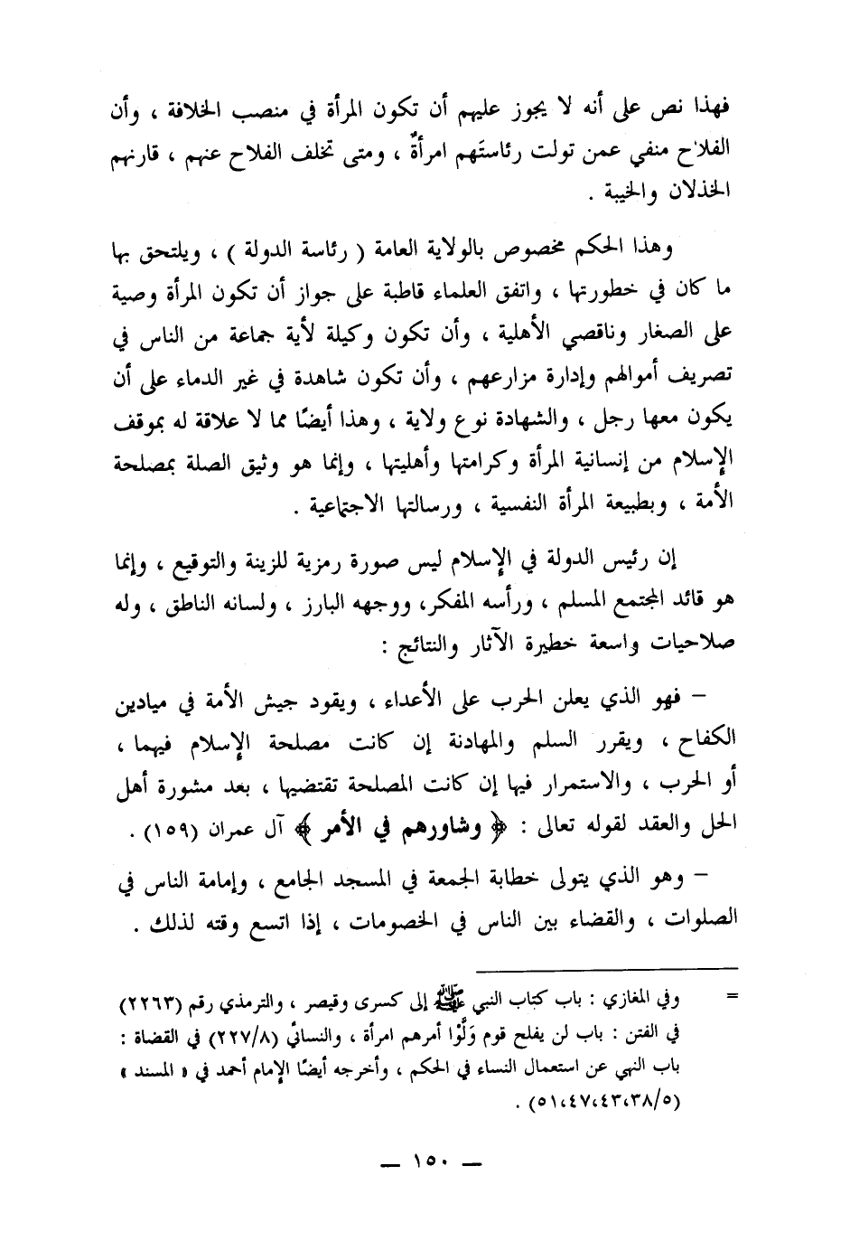 فهذا نص على أنه لا يجوز عليهم أن تكون المرأة في منصب الخلافة، وأن الفلاح منفي عمن تولت رئاستَهم امرأة، ومتى تخلف الفلاح عنهم، قارنهم الخذلان والخيبة.