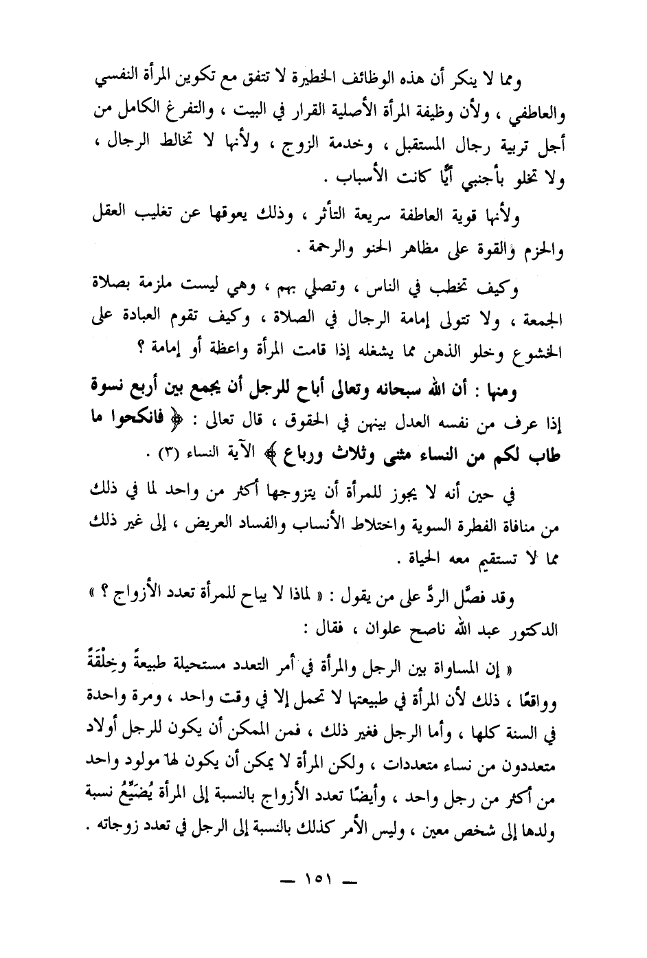 وقد فصَّل الردَّ على من يقول: " لماذا لا يباح للمرأة تعدد الأزواج؟ " الدكتور عبد الله ناصح علوان، فقال:
