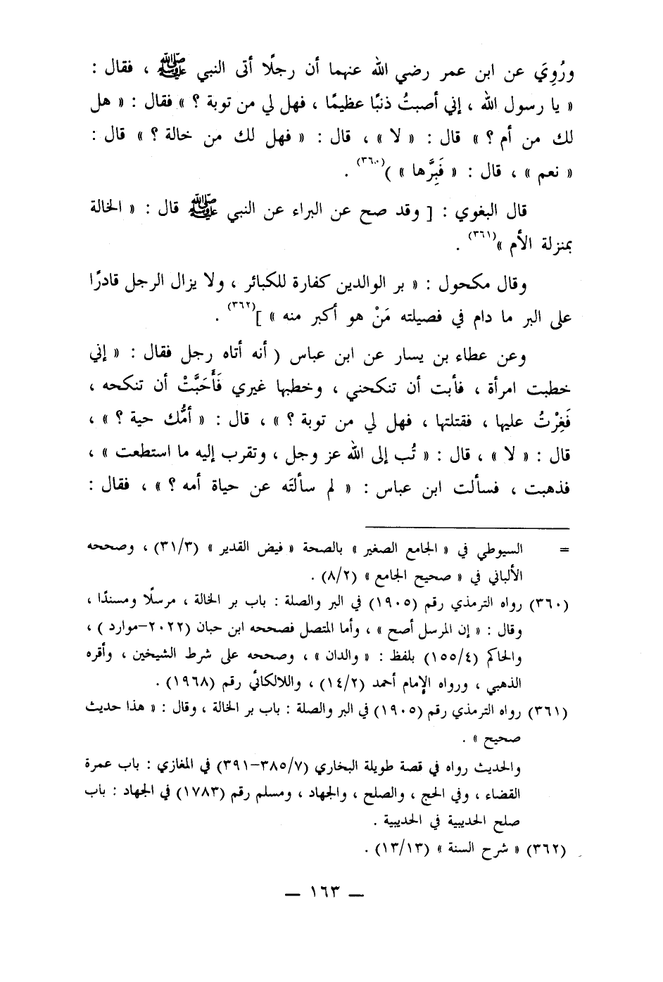 (360) رواه الترمذي رقم (1905) في البر والصلة. باب بر الخالة، مرسلا ومسندا، وقال: " إن المرسل أصح"، وأما المتصل فصححه ابن حبان (2022- موارد) ، والحاكم (4/ 155) بلفظ: " والدان "، وصححه على شرط الشيخين، وأقره الذهبي، ورواه الإمام احمد (2/14) ، واللالكائي رقم (1968) .